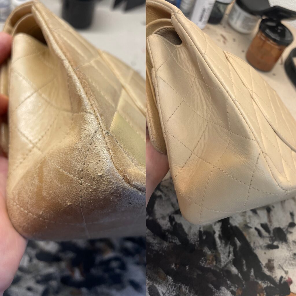 - Nähte: Besonders helle Kontrastnähte können mit der Zeit schmutzig wirken. Falls eine Tasche neu beschichtet wird, müssen die Nähte einzeln abgeklebt werden, damit sie ihre ursprüngliche Farbe behalten während das Leder gefärbt wird – das erhöht die Restaurationskosten weil ein wesentlicher Mehrwaufwand dadurch entsteht und Risiko für Fehler sein kann. Denn ist ein Stück Naht einmal gefärbt bekommt man es meist nicht wieder auf die Ursprungsfarbe zurück.